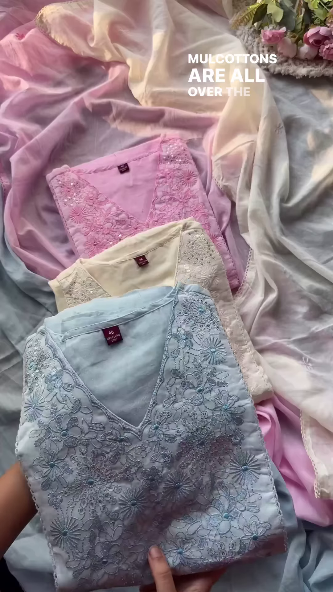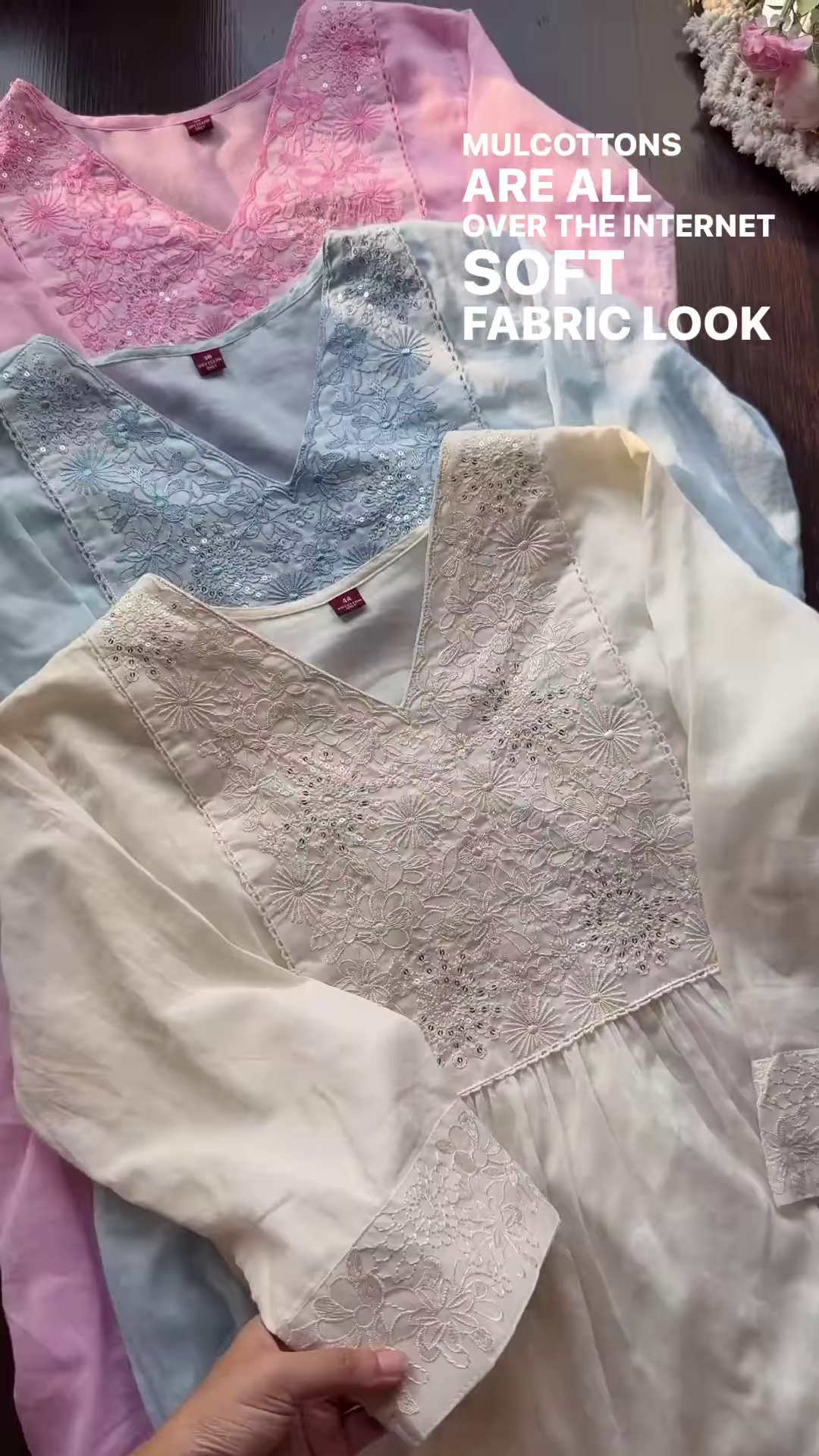 Step into softness and style with this trio of mulcotton V-neck kurtas, each featuring delicate floral embroidery on the neckline and cuffs. Available in pink, light blue, and cream, these garments are crafted from ultra-soft mulcotton fabric—celebrated across the internet for its breathable comfort and elegant drape. Whether you’re curating a boutique catalog or launching a WhatsApp campaign, this set offers timeless appeal and versatile styling. 🌸 Design Highlights: Floral Embroidery & V-Neck Elegance Each kurta showcases a classic V-neckline adorned with intricate floral embroidery in complementary tones. The embroidery extends to the cuffs, adding a touch of artisanal charm to the minimalist silhouette. – Pink Kurta: A vibrant yet soft hue with contrast embroidery that pops against the fabric. – Light Blue Kurta: Cool and calming, ideal for daytime wear or catalog shoots. – Cream Kurta: Neutral and graceful, perfect for layering or standalone styling. The embroidery is thoughtfully placed to enhance the neckline without overwhelming the design, making these kurtas ideal for both casual and semi-formal occasions. 🧵 Fabric: Mulcotton – Soft, Breathable, and Trending Mulcotton is a blend of cotton and modal, known for its lightweight texture and smooth finish. It’s trending across fashion platforms for its comfort, durability, and eco-friendly appeal. These kurtas offer: – Breathable wear for all-day comfort – Soft touch against the skin – Easy maintenance and long-lasting quality