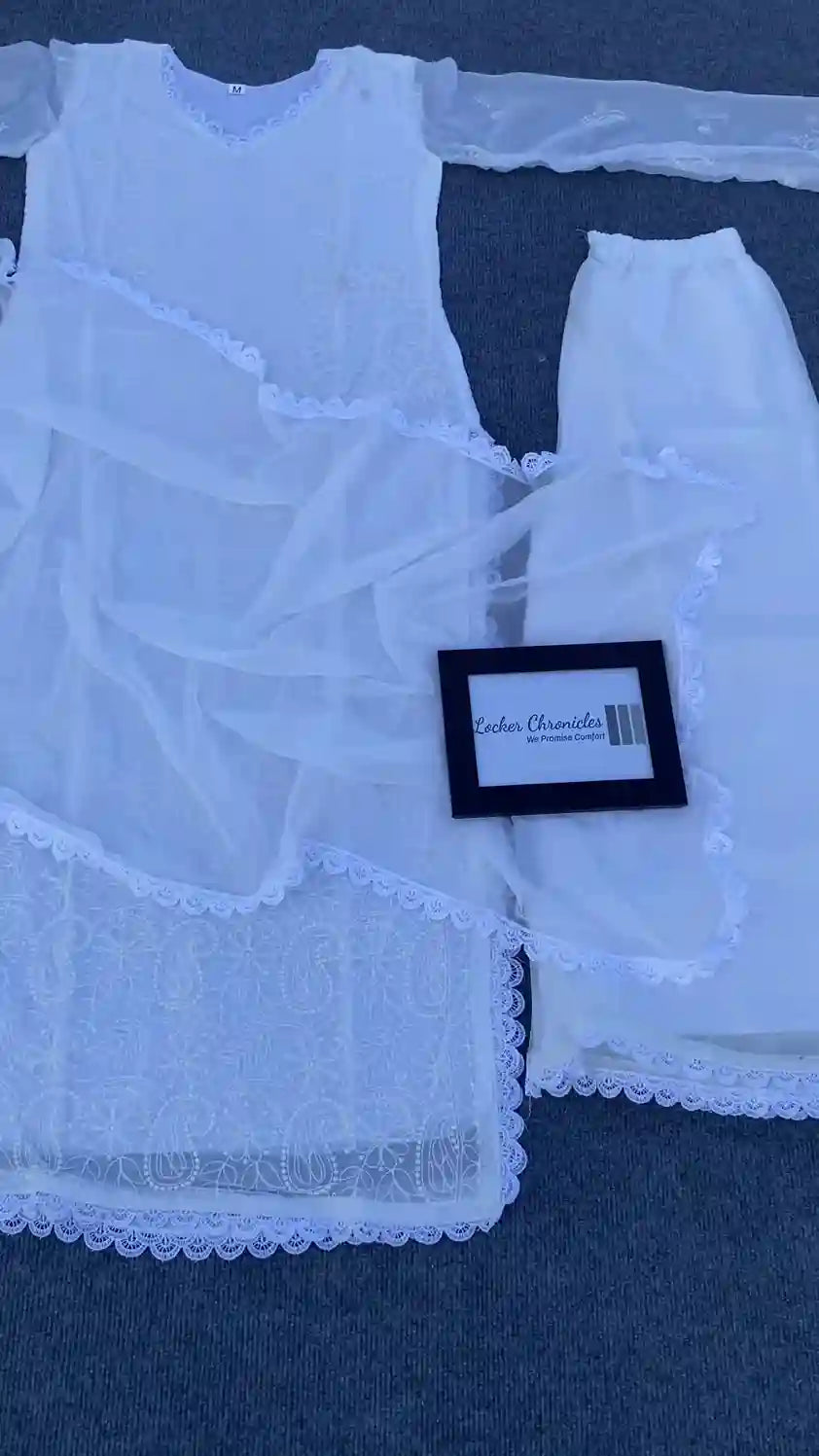 delicate and elegant white Georgette kurti set, featuring intricate embroidery and delicate lace trim. The set includes a long-sleeved kurti (tunic), matching pants, and a coordinating dupatta (scarf), all in a pristine white hue. The overall aesthetic is light, airy, and traditionally graceful.