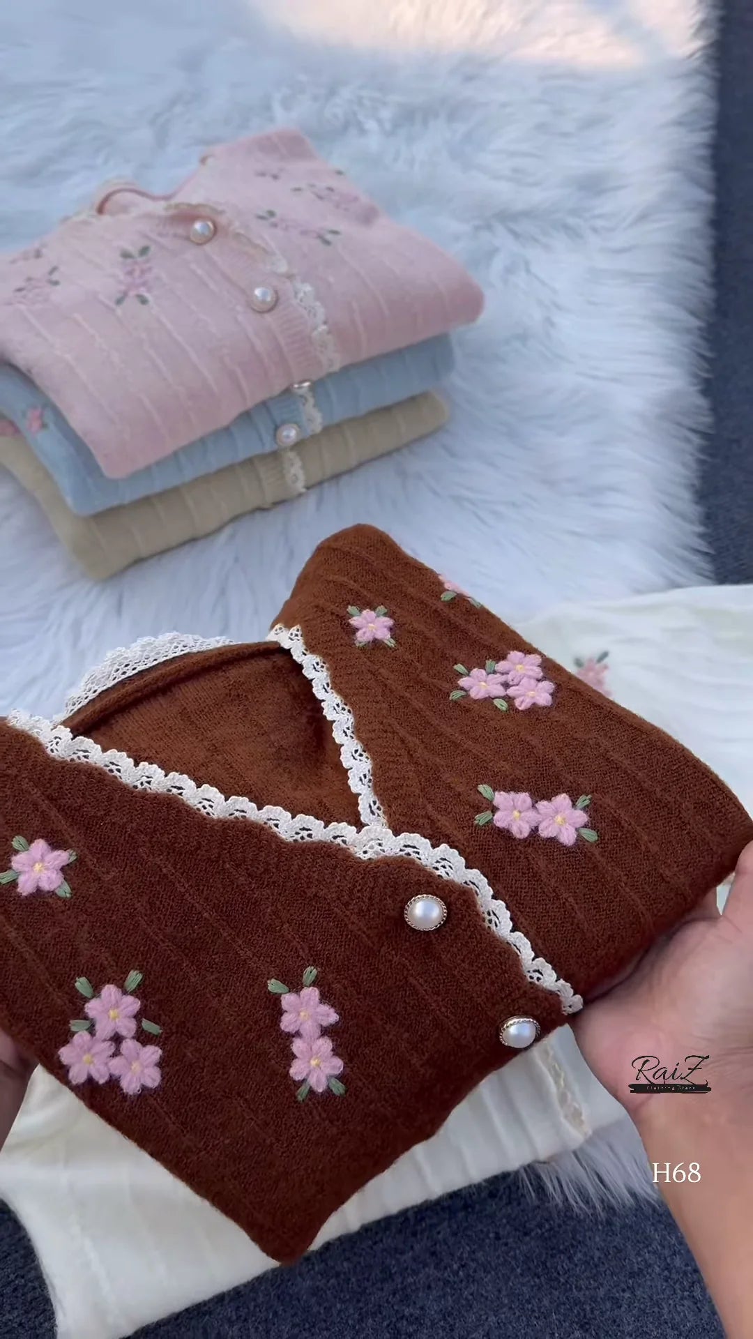 Bring soft elegance to your knitwear collection with this lace-trimmed floral cardigan set, available in three timeless shades—Pink, White, and Brown. Each piece features delicate embroidery, pearl-like buttons, and a romantic lace neckline that adds vintage charm to any outfit.