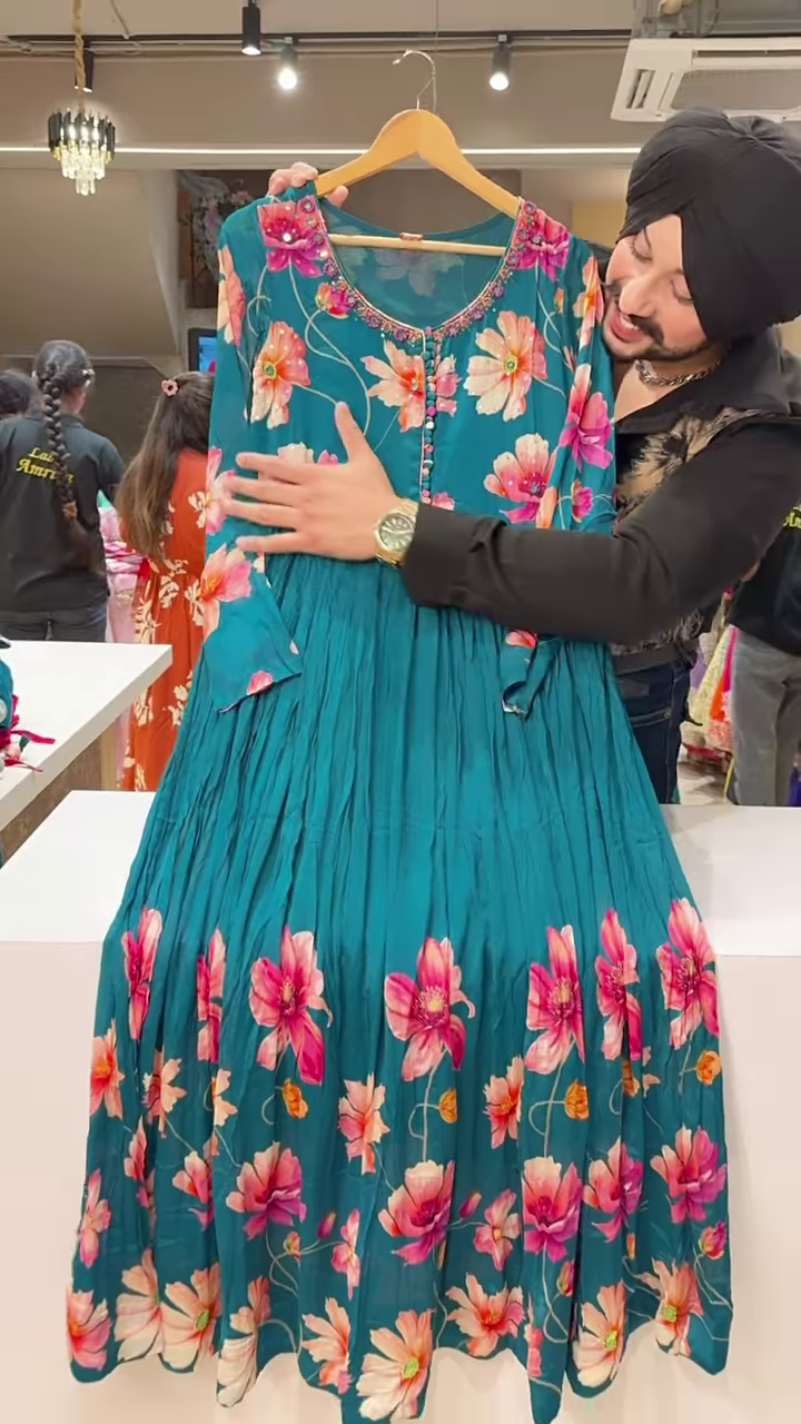 Elevate your ethnicwear collection with this stunning bright pink floral printed flared kurti, a perfect blend of vibrant aesthetics and graceful craftsmanship. Designed to make a bold yet elegant statement, this kurti is ideal for festive gatherings, casual outings, or semi-formal occasions where comfort meets style. Design & Aesthetic Appeal: The kurti features a lively bright pink base adorned with large floral motifs in soft pink hues, accented by yellow centers and green stems. The floral print is thoughtfully scattered across the fabric, creating a balanced and eye-catching visual flow. This design evokes a sense of freshness and femininity, making it a go-to choice for fashion-forward individuals who appreciate timeless floral patterns. Neckline & Embellishments: At the heart of this kurti’s charm is its round neckline, embellished with intricate embroidery that adds a touch of artisanal finesse. The embroidery work is delicate yet detailed, enhancing the neckline without overpowering the overall look. Complementing the embroidery are button details running down the front, which not only add a functional element but also contribute to the kurti’s traditional appeal. Fabric & Fit: Crafted from a flowy, breathable material, this kurti ensures all-day comfort while maintaining a graceful silhouette. The fabric drapes beautifully, allowing for ease of movement and a flattering fit across various body types. Whether you’re navigating a busy day or attending a relaxed evening event, this kurti offers both style and practicality.